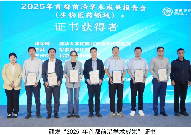 北京市怀柔区科学技术协会党组书记、常务副主席任会东发表致辞,深刻阐述了本次报告会对推动区域生物医药产业创新发展的重要意义。随后,任会东书记与北京市科学技术协会周宁主任共同为荣获“2025 年首都前沿学术成果”的7位科研人员颁发证书,以表彰其在生物医药领域的前沿探索与突出贡献。
